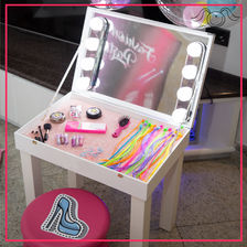 L’area è allestita con una postazione trucco, un tavolino per merenda e laboratori, un tappeto per la sfilata e un pannello per selfie con sfondo da set fotografico. L’animazione include la personalizzazione di magliette o cappellini, la creazione di outfit su mini manichini nel laboratorio “Diventa Stilista”, momenti di trucco e giochi con la musica, fino alla grande sfilata finale tra applausi, flash e tanto divertimento!